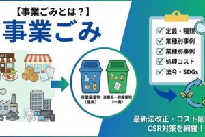 店舗やオフィスを運営する中で、「このごみは事業系ごみ?それとも家庭ごみと同じように捨てていいの?」と迷った経験はありませんか?事業活動から出るごみ(事業系ごみ)は、法律や各自治体の条例によって厳格に処理方法が定められており、家庭ごみと同じように集積所へ出すことは原則として禁止されています。本記事では、事業系ごみの基本的な定義や分類、最新の法令(廃棄物処理法など)に基づく正しい処理方法を解説します。 事業系ごみとは-定義・分類と一般ごみとの違い 事業系ごみの基本的な定義と法的区分 事業系ごみとは、企業や店舗などの「事業活動に伴って生じたごみ(廃棄物)」の総称です。事業の規模に…